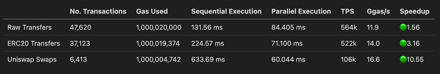 Note: These tests are conducted in a closed environment, we’re testing the execution stage purely with an in-memory state. Mileage will vary when running a full node, state access and additional steps in the block processing pipeline will bring these numbers down significantly.