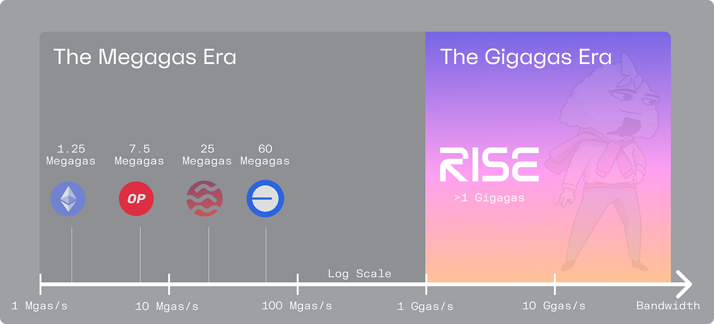This is the lens through which the RISE team has designed the RISE stack. We’re here to report a new Era of EVM bandwidth is nearby, the Gigagas Era. The mission for RISE is to usher in this Era, initially delivering a one gigagas/s Layer 2 stack, and we’re just getting started (10+ Gigagas isn’t out of reach!). Let’s put this in perspective, a Gigagas layer 2 is equivalent to having 800 Ethereum L1s all sharing the same state!
