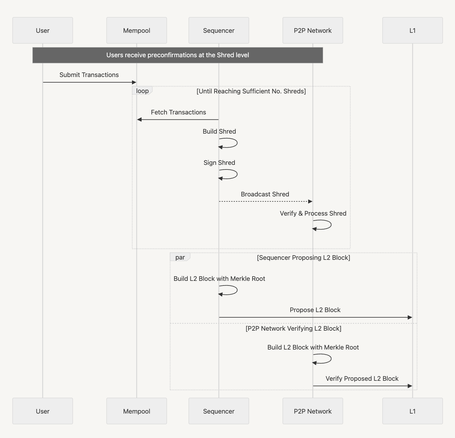 - L2 blocks are partitioned into smaller \(\mathtt{Shreds}\) for faster propagation and preconfirmations.