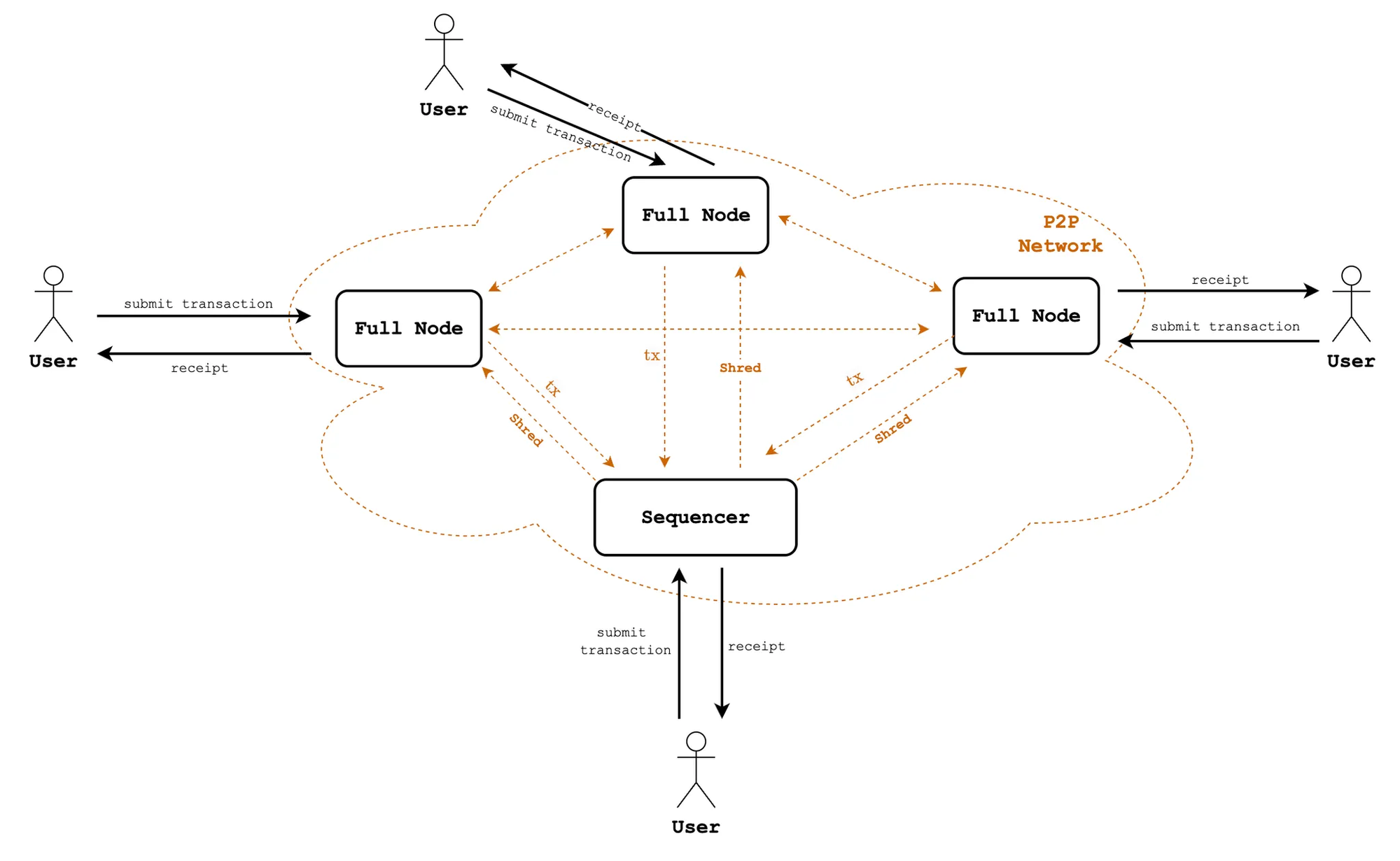 - Once a \(\mathtt{Shred}\) is built, it is immediately broadcasted to all following nodes in the P2P network. This \(\mathtt{Shred}\) serves as preconfirmations for all transactions it contains, providing users with blocktime multiple time faster than usual.