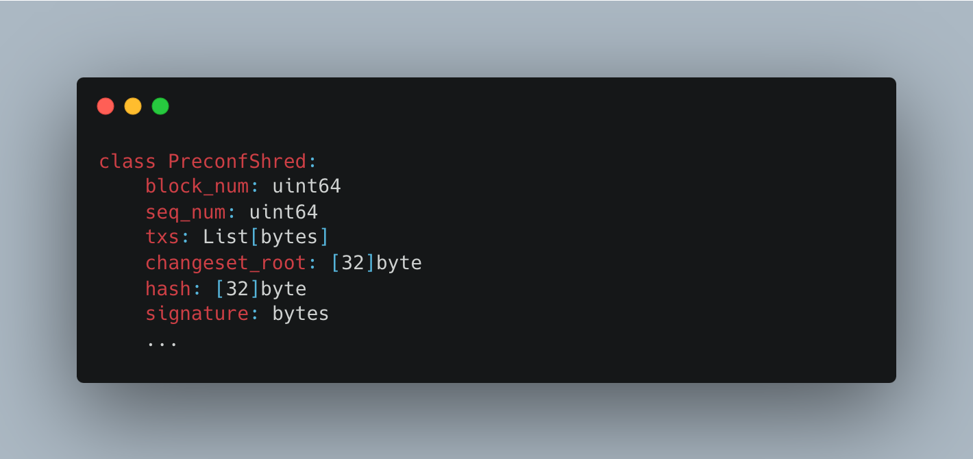 - Transactions in mempool are incrementally batched into \(\mathtt{Shreds}\) following pre-defined ordering rules. A \(\mathtt{Shred}\) only commits to changes within its transactions and does not perform merkleization. This enables fast \(\mathtt{Shred}\) with higher throughput than regular blocks.
