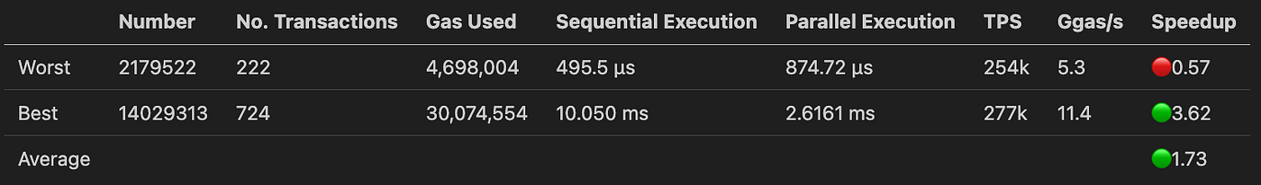 A variety of Ethereum blocks were chosen randomly and tested. The key result is pevm is 1.73x faster on average than the typical sequential execution. The fastest block was 3.62x faster, but some block were slower. This is typical for the smaller blocks with more dependencies that we see in early Ethereum history.