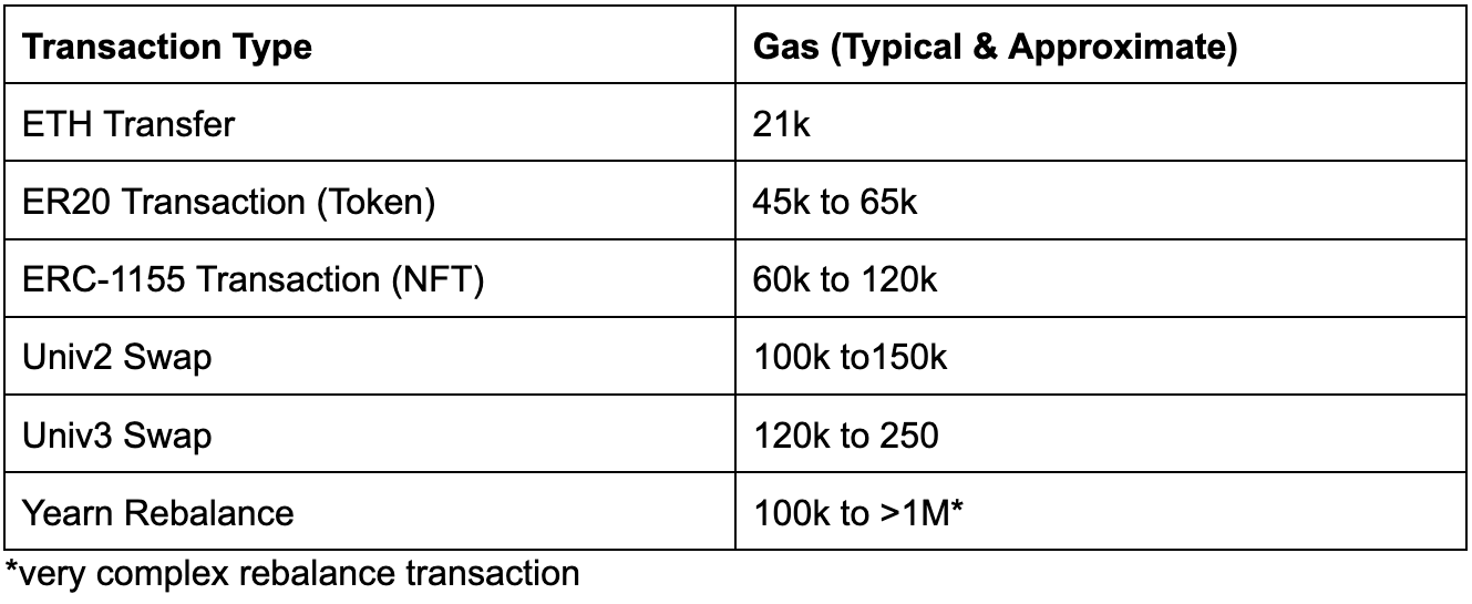 So if you hear blockchain X can support 1000 TPS, you won’t know if that’s 1000 ETH transfers, SWAPs or something else. Whereas, if you’re told it can support 10 Megagas/s you will know that’s ~500 ETH Transfers per second, or as little as 10 Yearn rebalances!
